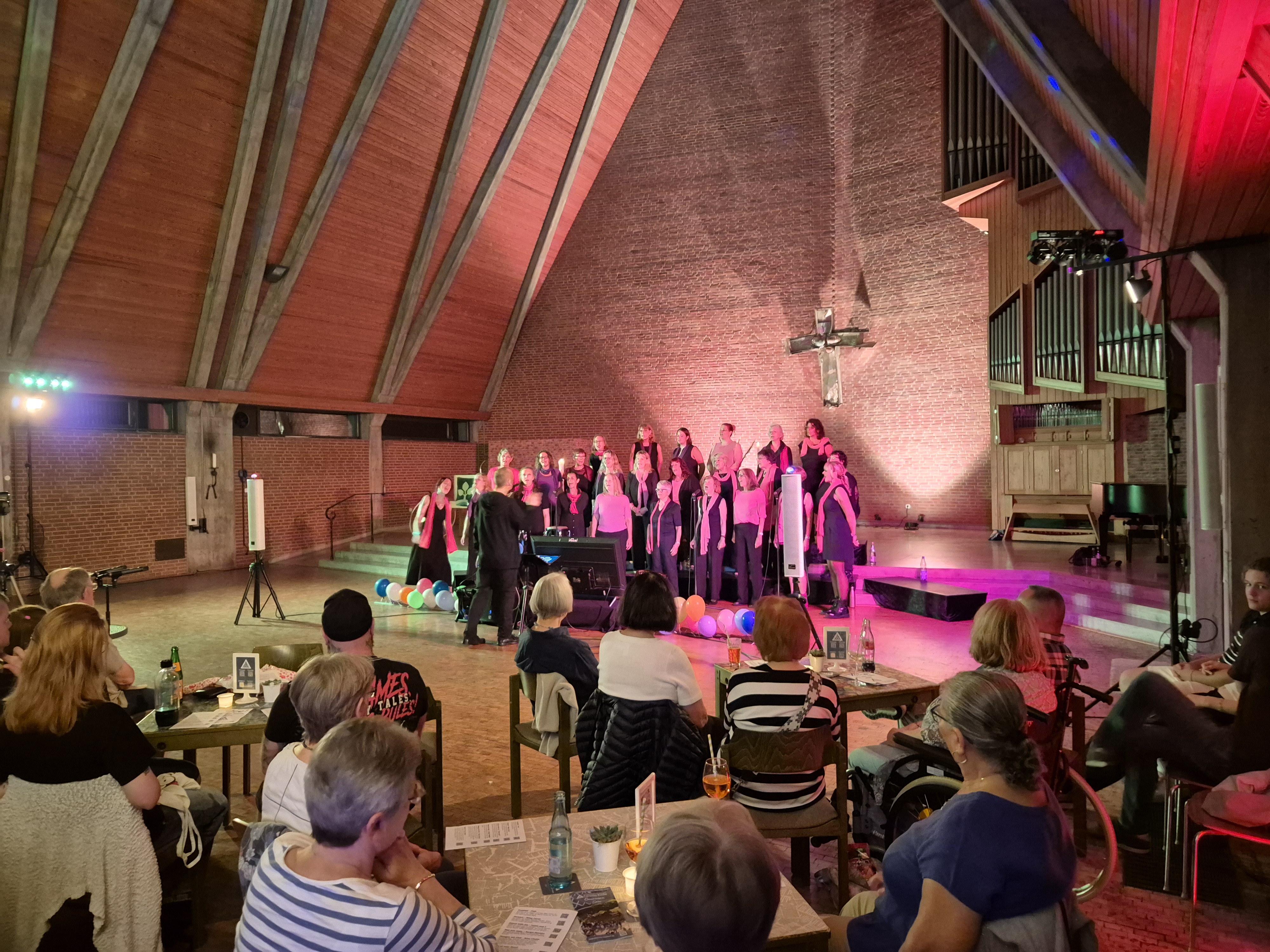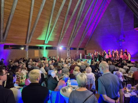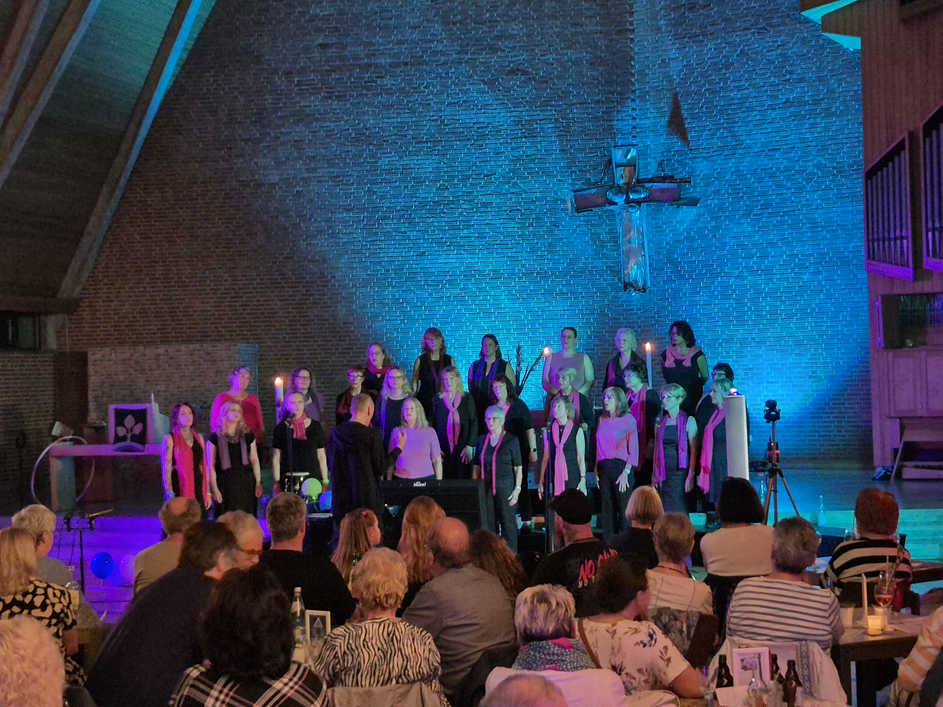 Am 20. September hat der Voice!-Chor in der Kirche sein jahreskonzert gegeben. Dabei beeindruckten die Sängerinnen mit ihrem Chorleiter Anton Moll mit ihrem vielfältigen Repertoire von ABBA bis Nina Chuba. In der vollbesetzten Kirche kamen bei einer Nummer zudem leuchtenden Hula-Hup Reifen inlusive Choreografie zum Einsatz. Hinzu kam der Live-Auftritt eines Tanzpaares vom Tanzcenter Kressler, das eindrucksvoll zeigte, wie Chormusik und Tanz miteinander verbunden werden können.
