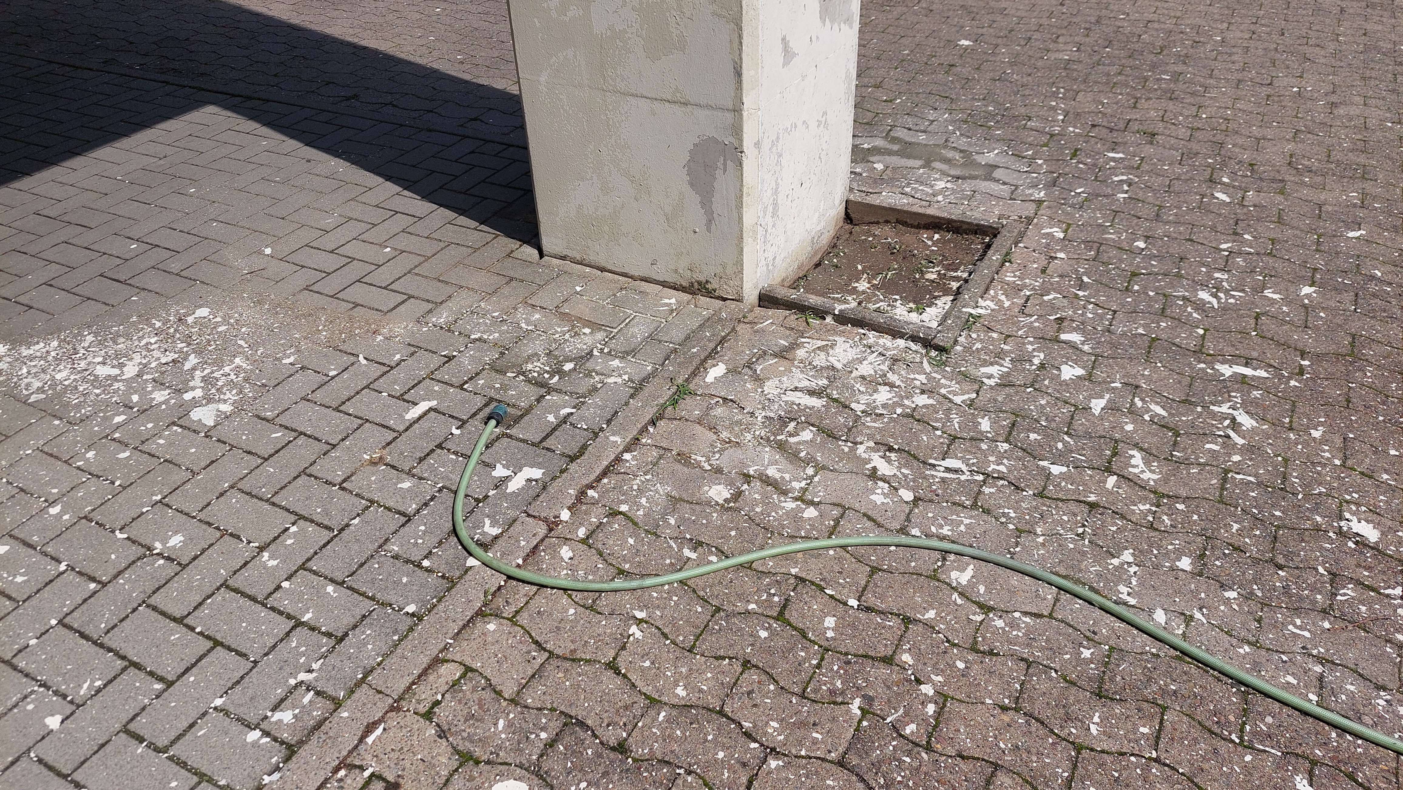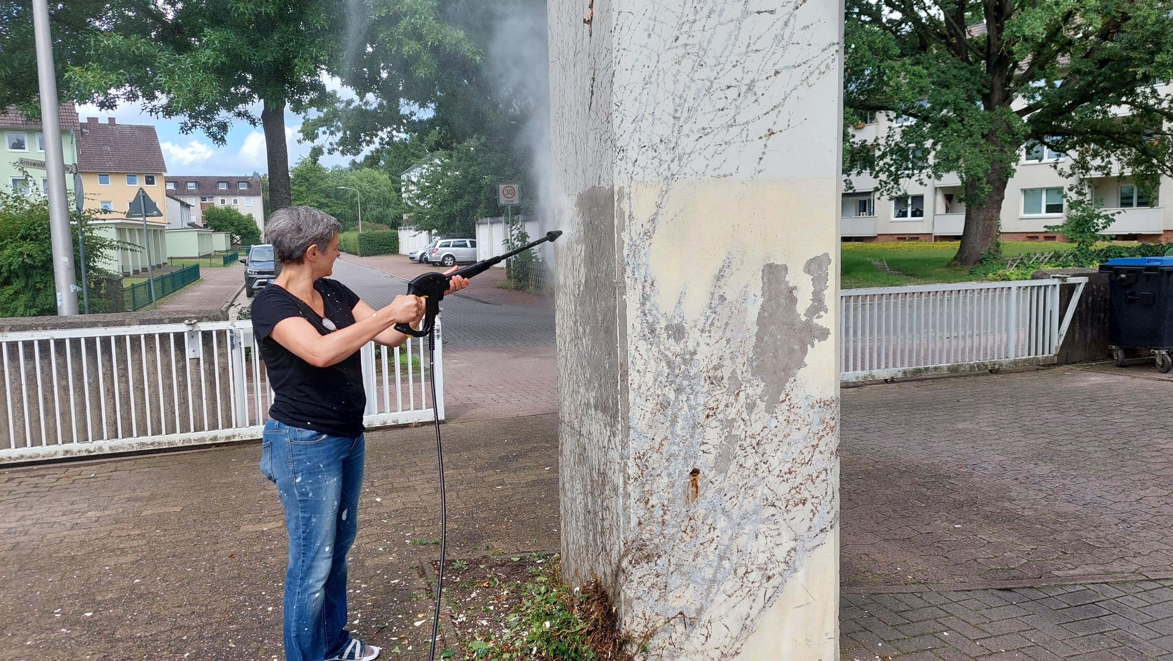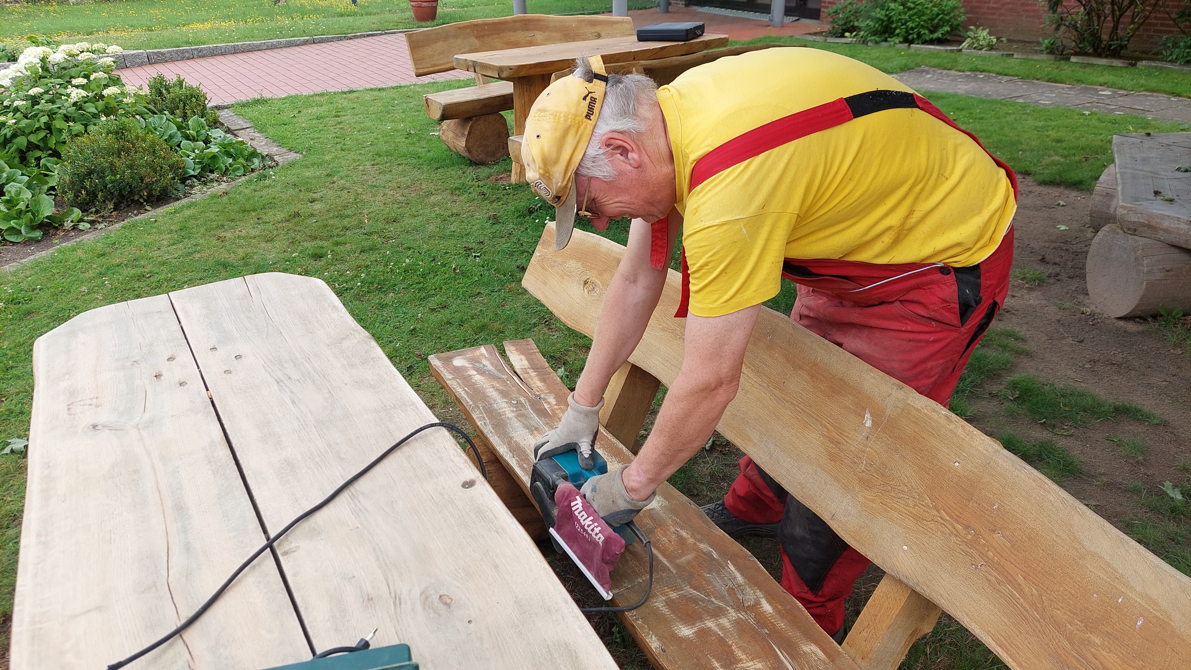 Am vergangenen Samstag wurde auf der Außenfläche vor der Kirche fleißig geschliffen, gekärchert und gespachtelt. Dabei wurden die Sitzbänke, die im vergangenen Jahr mit Hilfe des Freiwilligen Kirchgeldes gekauft wurden, abgeschliffen und neu lasiert, sodass sie wieder gut vor Wettereinflüssen geschützt sind. Zudem wurden die Pfosten des Kirchturms in einem ersten Schritt vom groben Dreck befreit, auch Teile der alten Farbe wurden abgespachtelt und -gekärchert. Ziel ist es, den Kirchturm bald attraktiv gestalten zu können - dafür werden jedoch noch weitere Arbeiten nötig sein. Insbesondere die Reste des Efeus, das viele Jahre lang am Turm wuchs sowie die aufgrund der enormen Höhe schlechte Erreichbarkeit einiger Kirchturmteile, erschweren die Arbeiten.