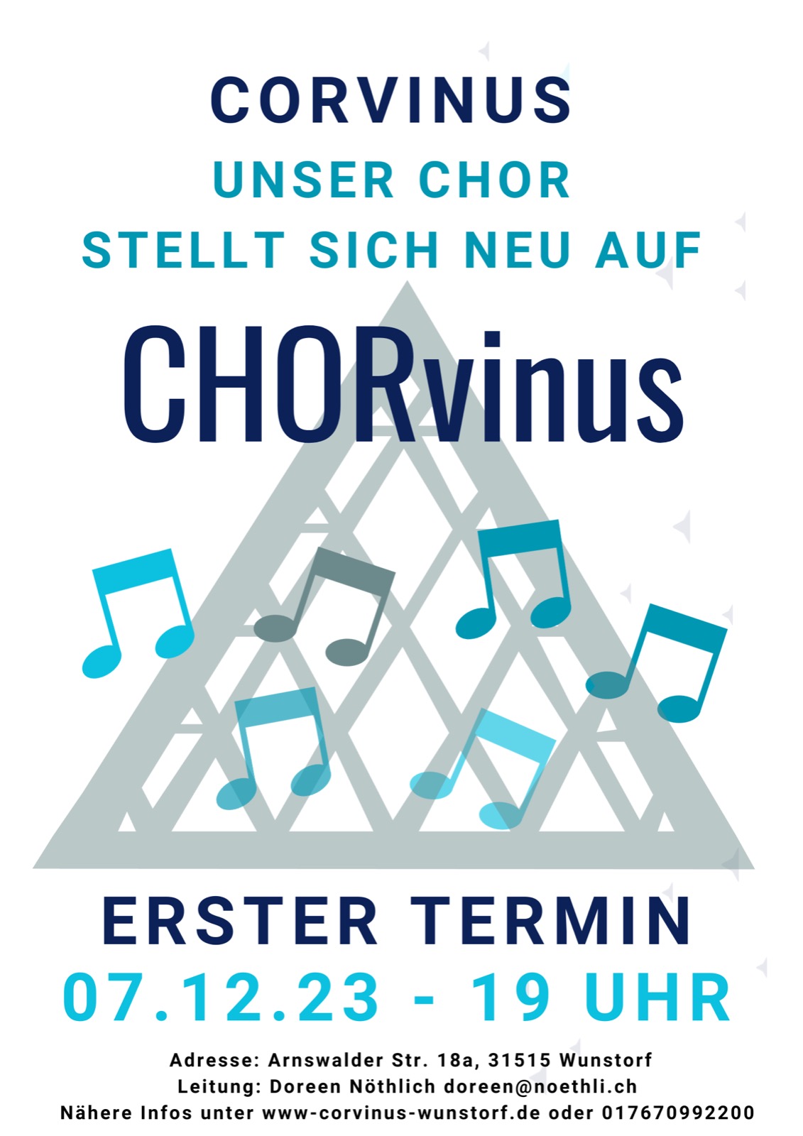 Die Proben finden ab dem 7. Dezember alle vierzehn Tage von 19 Uhr bis 21.30 Uhr im Gemeindehaus der Corvinusgemeinde statt. Wir freuen uns, dass wir eine so engagierte junge Chorleiterin gewinnen konnten!