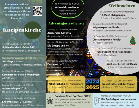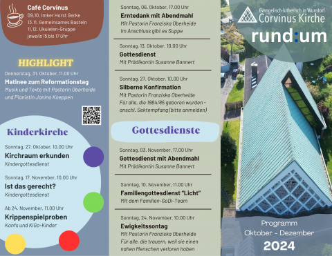 Um eine bessere Übersicht über unsere vielfältigen Veranstaltungen zu ermöglichen, gibt es ab sofort den neuen Flyer "Corvinus rund:um", auf dem jeweils für drei Monate unsere bevorstehenden Gottesdienste und Veranstaltungen aller Art zu finden sind.