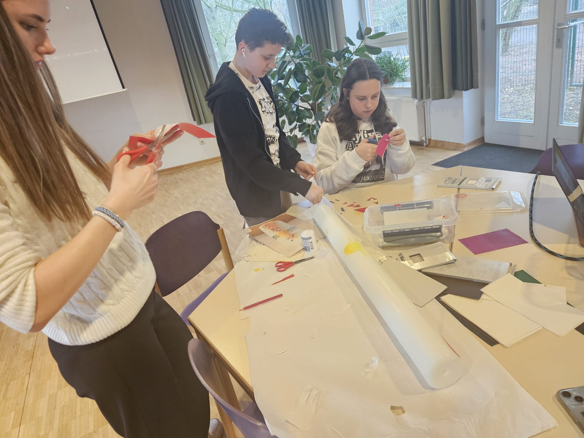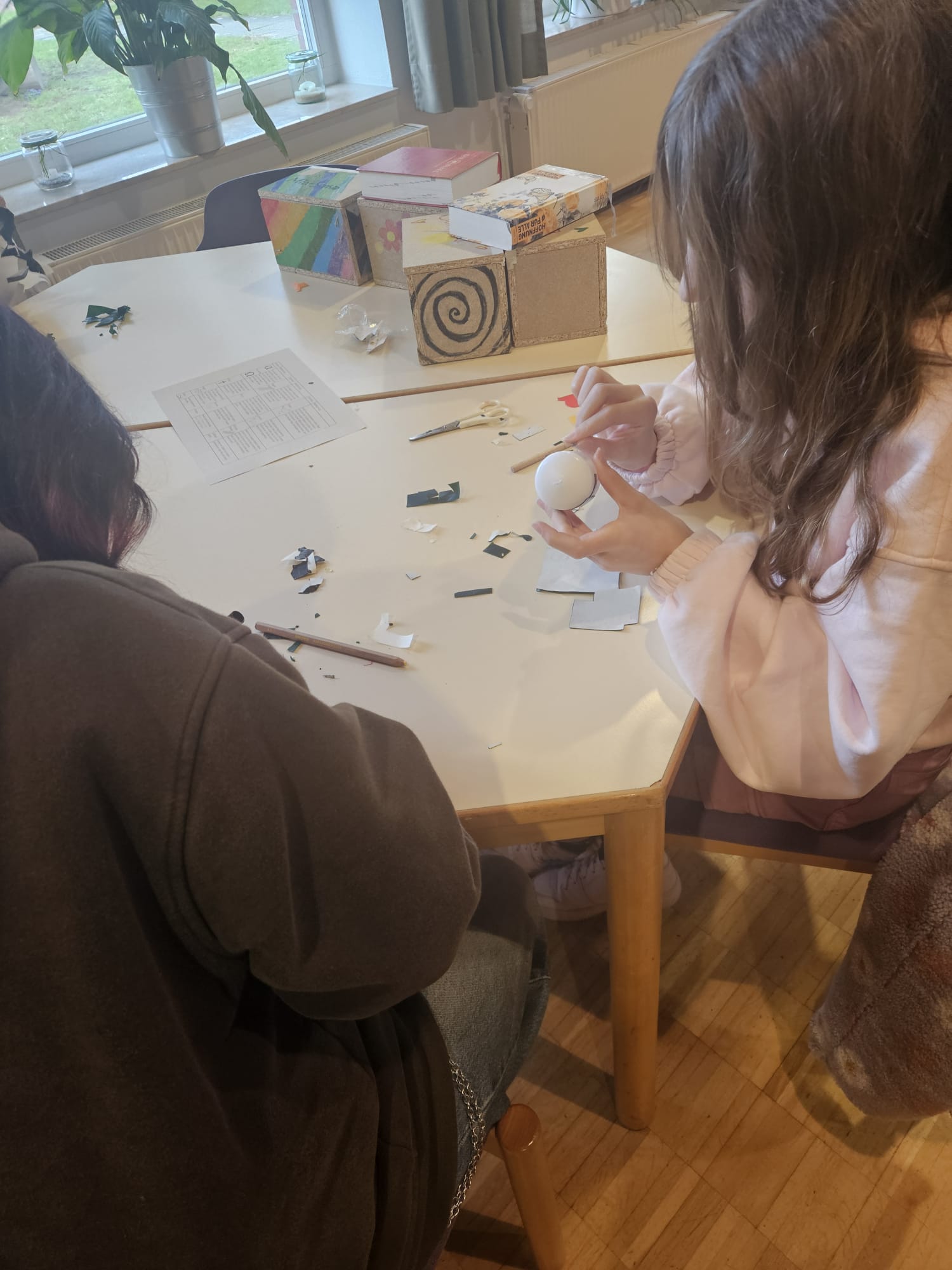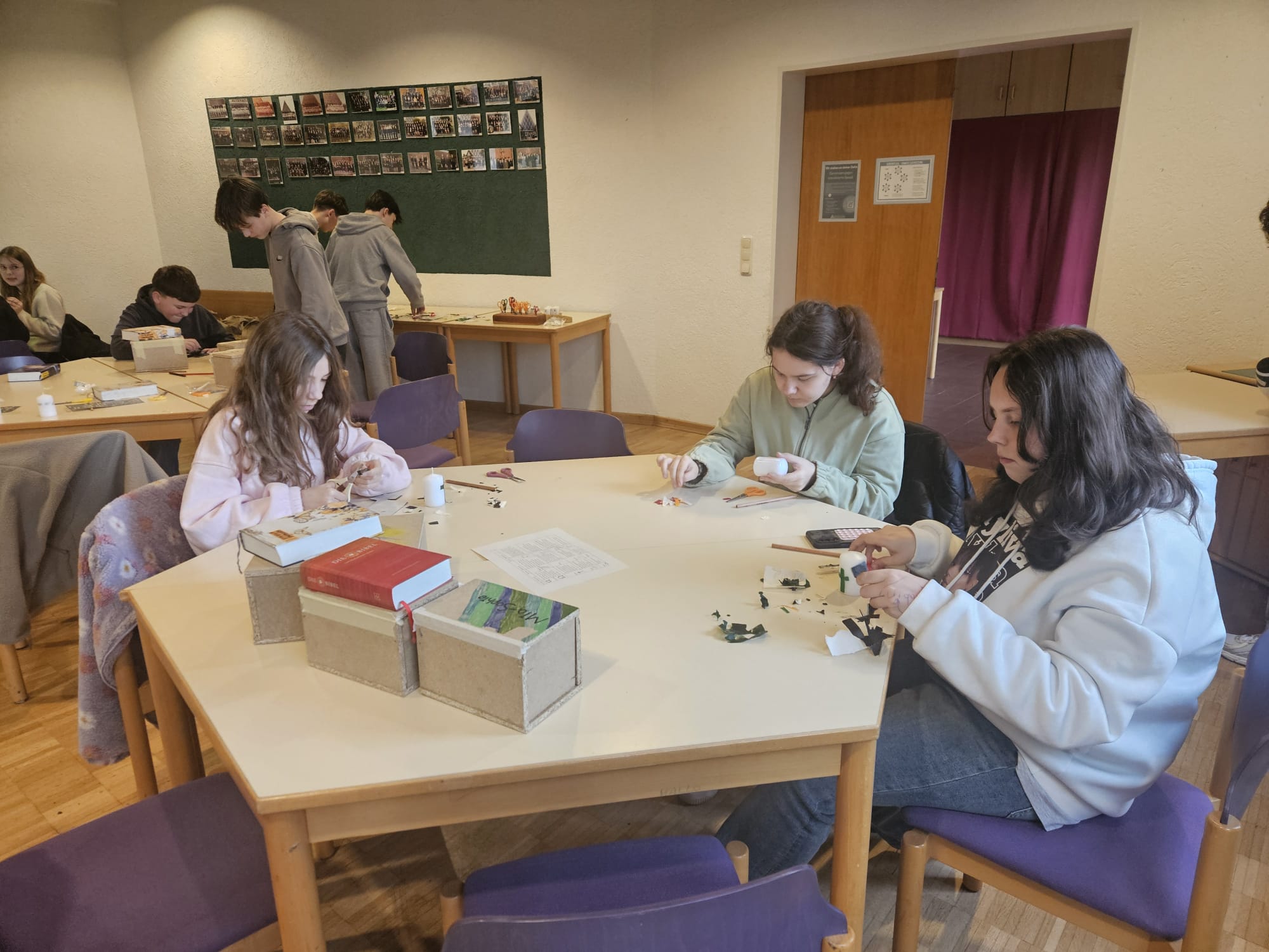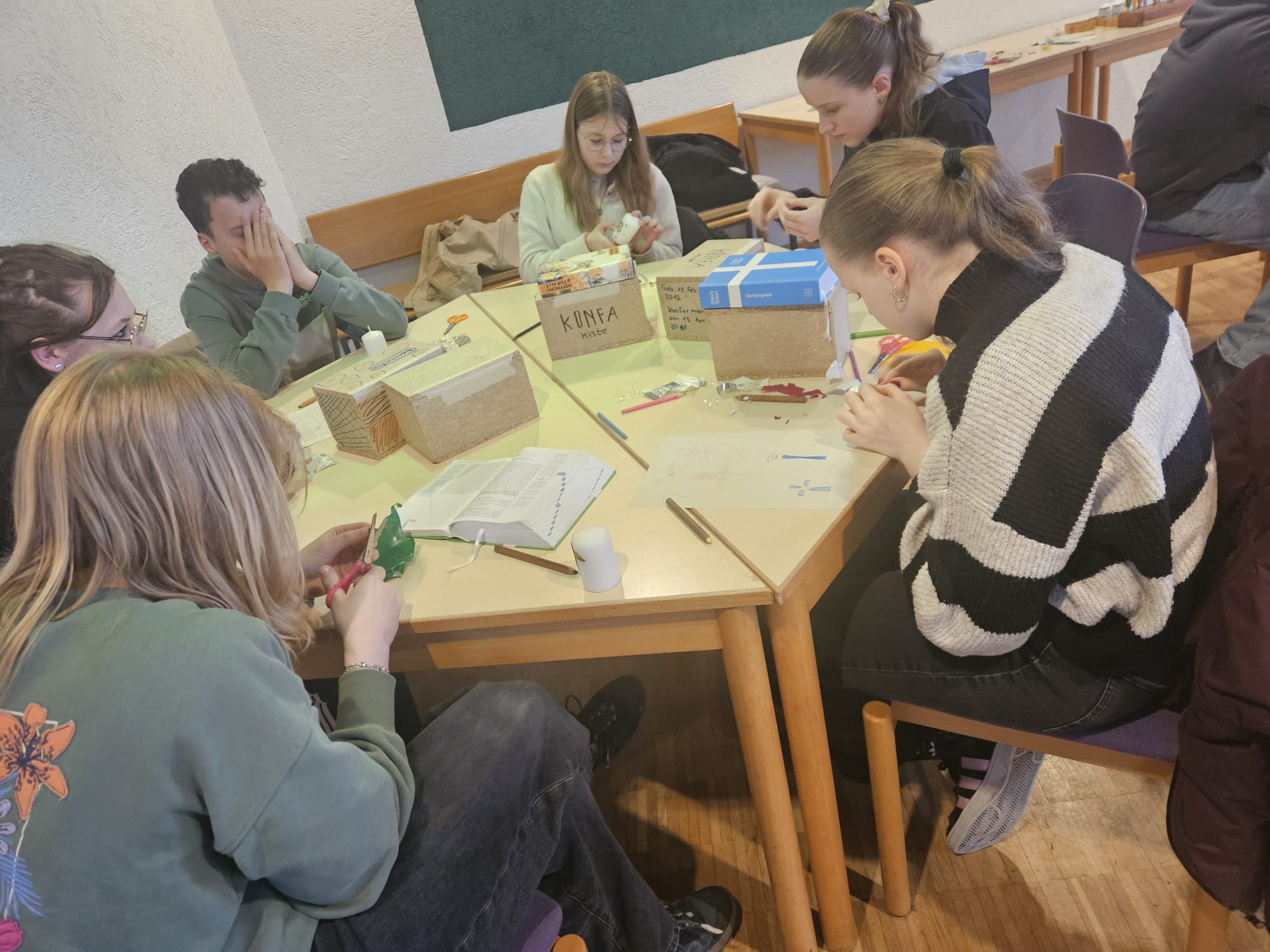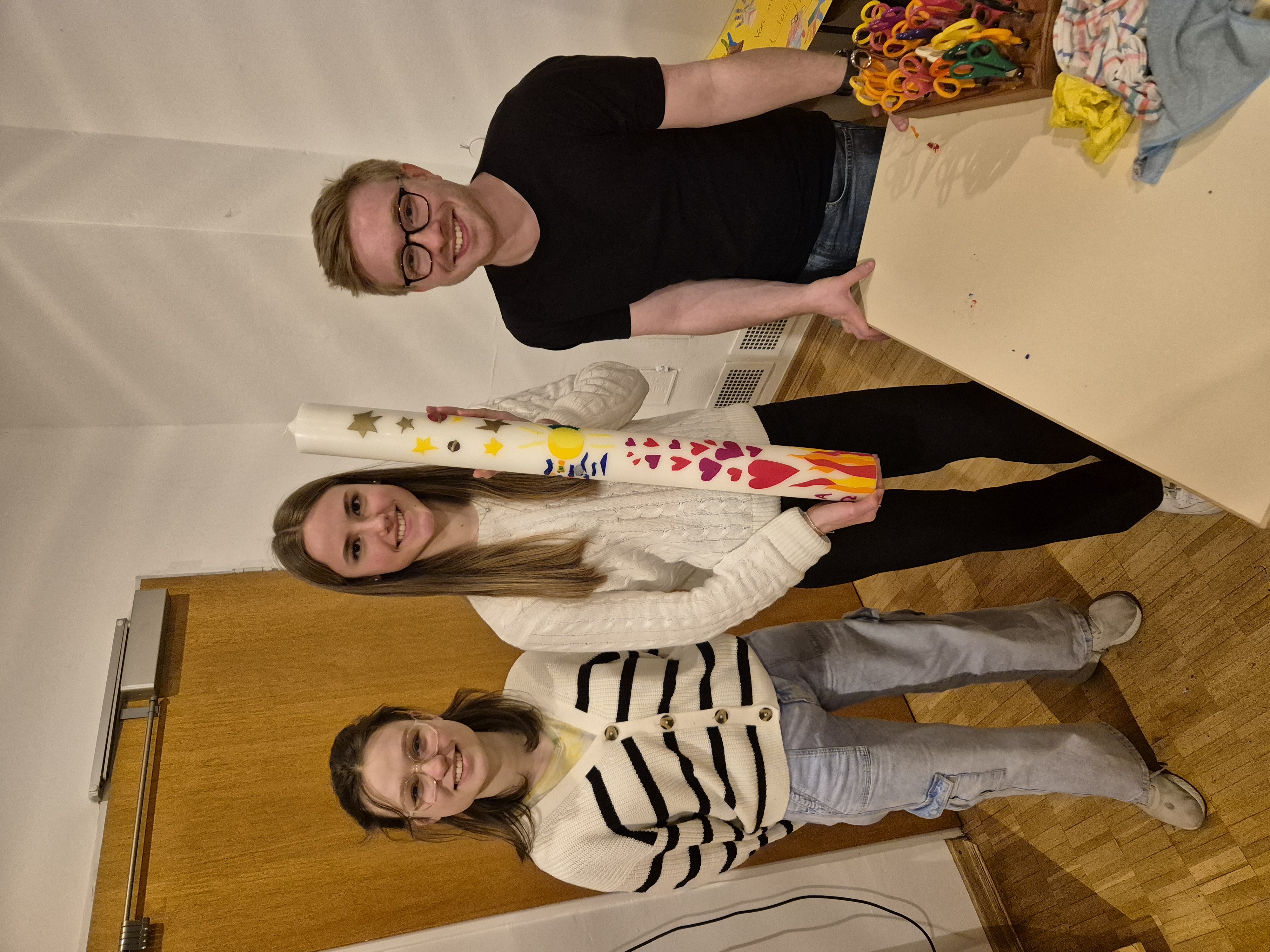 Auch in diesem Jahr wurde die Osterkerze für die Kirche wieder von den Konfirmandinnen und Konfirmanden gestaltet. Unter Anleitung der Teamerinnen Annemarie und Nelli sowie Vikar Jonas Hauschildt entstanden neben der großen Kerze auch viele kleine Osterkerzen, die alle persönlich gestalten konnten.