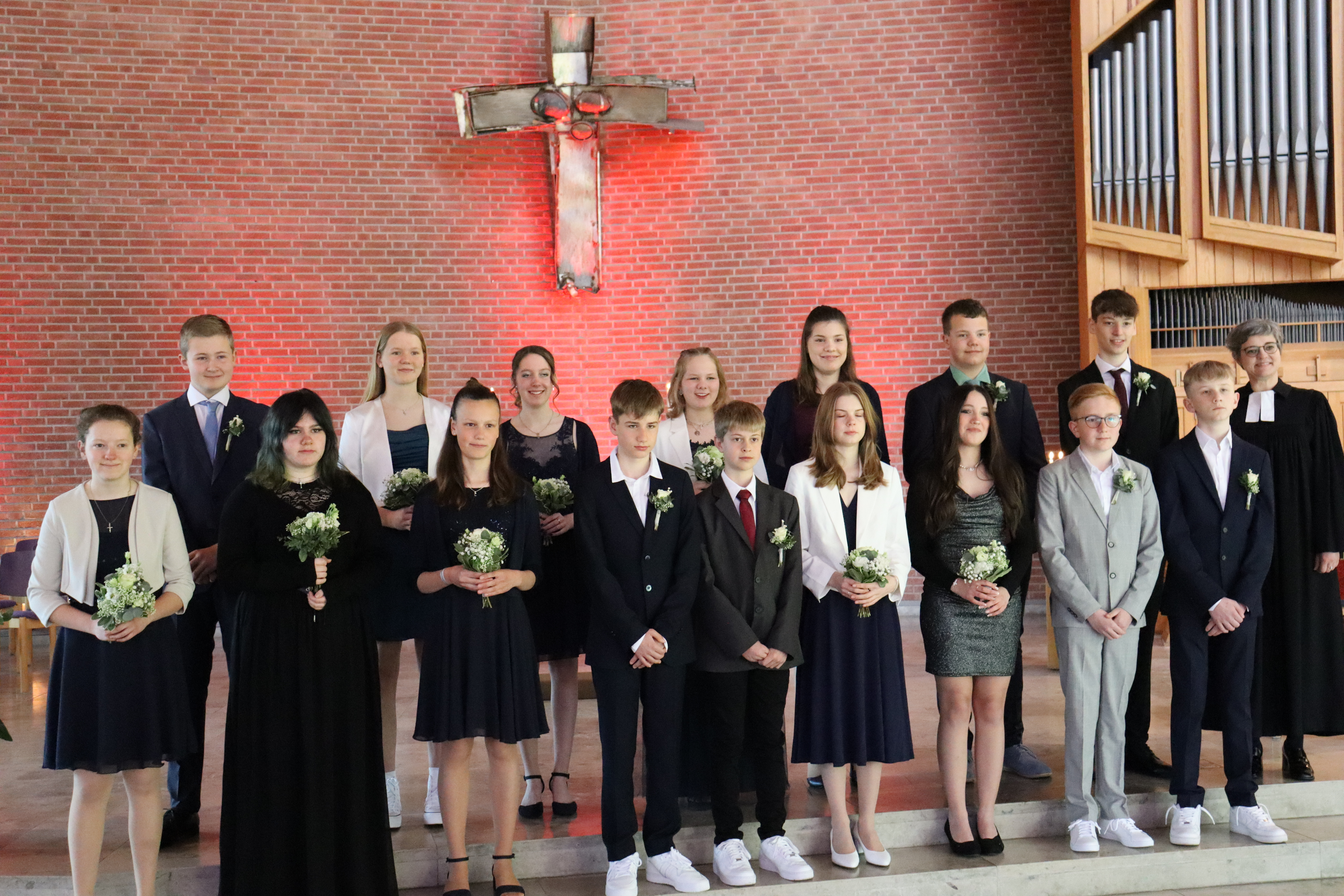 Es ist geschafft! Nach eineinhalb Jahren Konfirmandenzeit in unserer Gemeinde wurden am letzten Sonntag 16 Konfirmandinnen und Konfirmanden in einem feierlichen Festgottesdienst von Pastorin Franziska Oberheide konfirmiert. Die Jugendlichen können auf eine ereignisreiche Zeit zurückblicken: Besuche von zahlreichen Gottesdiensten, die gemeinsame KonferZeit unter der Woche, die Konfirmandefreizeit nach Bad Münder im letzten Herbst oder auch die eigene Gestaltung der Vorstellungsgottesdienste. Mit ihrem "Ja" zur Konfirmation bekräftigen sie ihre Taufe und sagen "Ja" zu Gott. Im Rahmen der KonferZeit haben sie sich mit den großen Fragen auseinandergesetzt, damit gerungen, darüber diskutiert und möglicherweise auf die eine oder andere Weise auch eigene Antworten gefunden. Nun sind sie mündige und gleichberechtigte Mitglieder unserer Gemeinde.